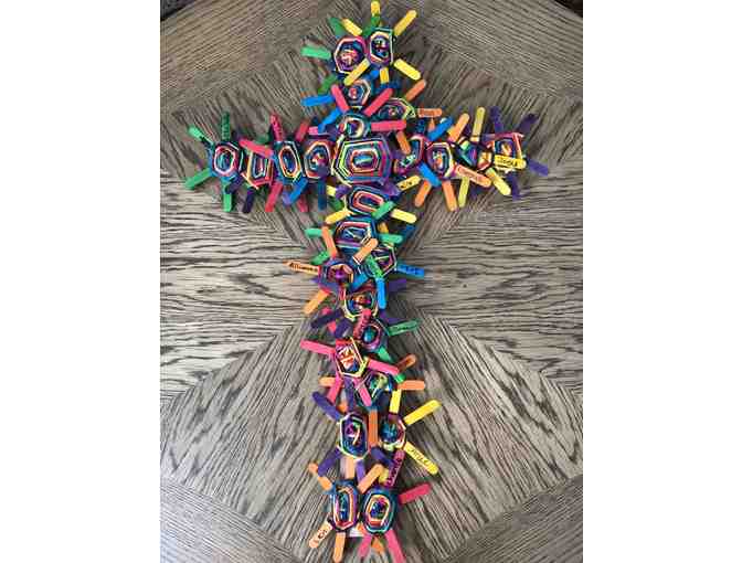 5th Grde Cross. This fun, colorful, cross made of individual God's Eyes created by the 5th grade class. This wall-hanging cross measures 24 x 14. You'll want to be the winner of this priceless momento of 5th grade! Come take a look in the school lobby! This item closes on Thursday at 10pm.