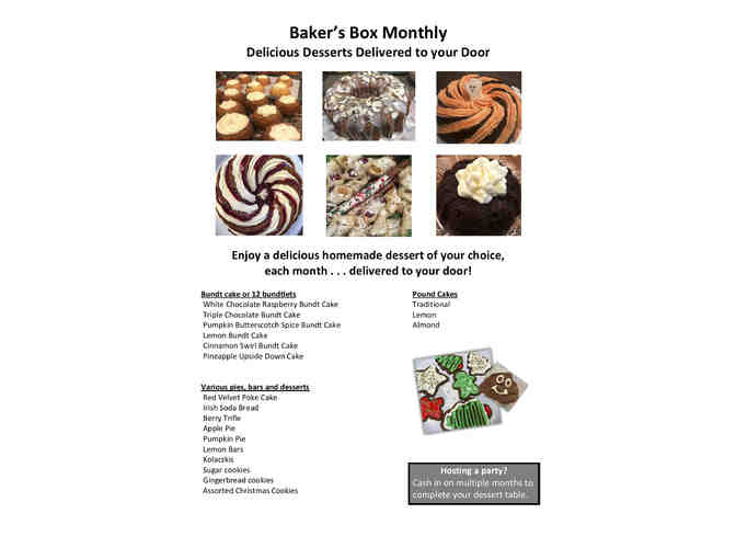 Enjoy a delicious homemade dessert of your choice each month...delivered to your door! Many offerings to choose from, including bundt and mini bundt cakes, Irish soda bread, red velvet poke cake, kolaczkis, and many different types of pies and cookies. This package is perfect for hosting, to use as hostess gifts, or to celebrate various special occasions in your home!