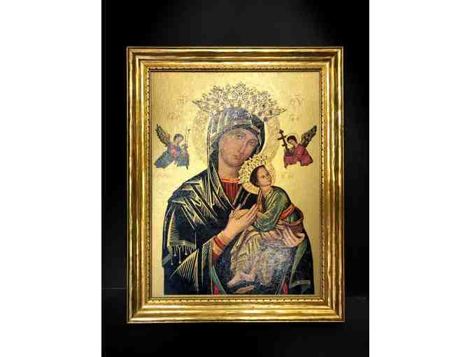 This gorgeous icon of Our Lady of Perpetual help is a true copy of the ancient miraculous image of Our Mother of Perpetual Help and has been touched to the original, which is venerated in the Redemptorist Church of Saint Alphonsus in Rome.