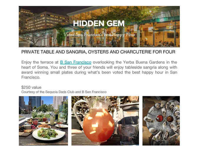 Celebrate with a private table for four on the terrace at B Restaurant SF overlooking Yerba Buena Gardens. Table-side sangria and small plates will be provided. You will not be disappointed! Dates are flexible and can be coordinated directly with the restaurant.