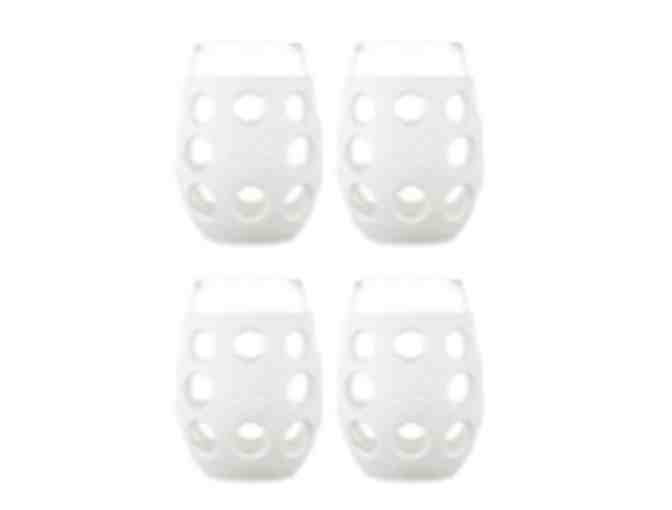 Update your barware with these 17 oz stemless wine glasses in arctic white. This set of four glasses is both beautiful and functional and feature glass surrounded in a non-slip silicone sleve.
