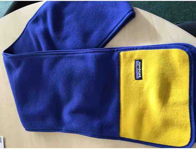 Brand new fleece scarf by Patagonia. Color is mostly royal blue, with one patch of bright yellow for contrast. Bundle up against the elements or gift this to a friend!
