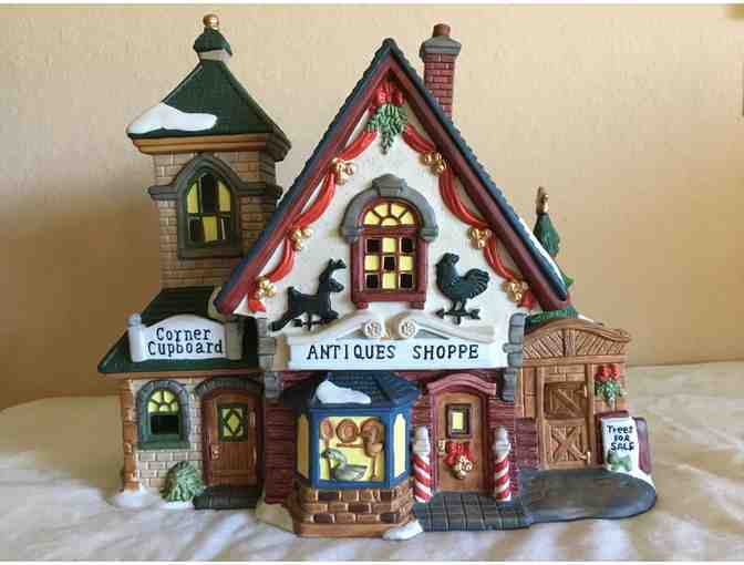 Vibrant hand-painted porcelain Antiques Shoppe is a great additional to your village display.  Pre-owned 1999 Victorian Series village business.  The Victorian collection is the largest collection of the series, featuring 20 business establishments and lighthouses.  They are modeled after traditional England and New England structures.