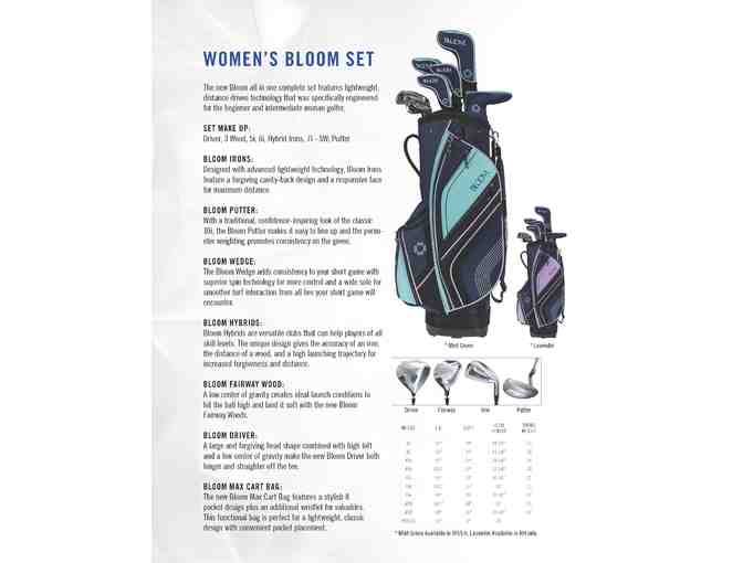 The new Bloom all in one complete set features lightweight, distance driven technology that was specifically engineered for the beginner and intermediate woman golfer. Designed with advanced lightweight technology, Bloom Irons feature a forgiving cavity-back design and a responsive face for maximum distance.