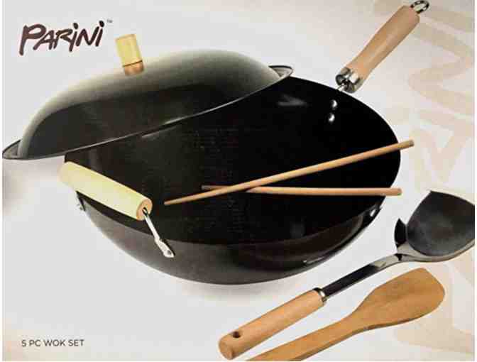 This 5-piece Asian Wok Set includes; Wok, Lid, Chopsticks, Iron Spatula, and Wood Spatula.