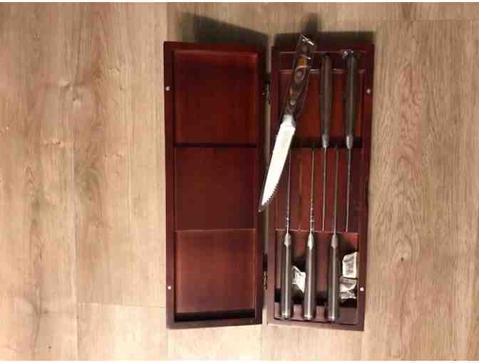 Add this beautiful steak knife set to your BBQ/Grilling collection. The marbled wood, finished in a sleek, shiny finish will add class to any meal.