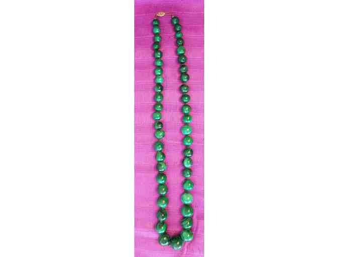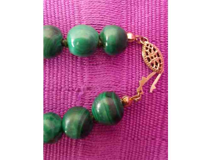 This graduated malachite bead necklace is the unique statement piece that can go with any outfit.  The stunning green color is offset by its vermeil safety clasp. The 25-inch length plays nicely to the stature of the stones.  This vintage graduated Malachite bead necklace was purchased in the Democratic Republic of the Congo.