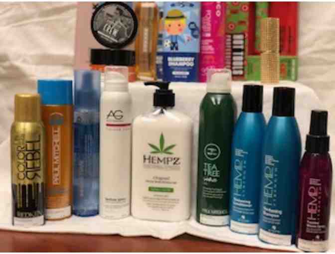 KMS silk sheen conditioner, KMS silk sheen shampoo, limited edition retro vibe Hot Tools 24K Gold Curling Iron, Circle of Friends Blueberry Shampoo and Detangler, Joico Power Whipped Foam Mousse, AG Colour Care Aerodynamics finishing spray and defining/texture spray, American Crew Grooming Cream, Hemp Fibrous Definition & Shine Medium Hold Putty, Alterna Hemp Strength Thickening Shampoo and Conditioner, Alterna Hemp Strength Tousled Waves Spray, L'Oreal Professionnel Mythic Nourishing Oil, Hempz Original Herbal Body Moisturizer, Redken Color Rebel gold glitter spray, Paul Mitchell Sun Recovery Hydrating Shampoo, Paul Mitchell Tea Tree Shave Gel, Sparkly Barrel Retractable Powder Brush,