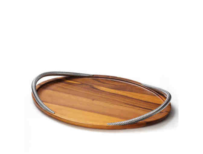 Opposites attract. Combining lustrous braided handles with sleek acacia wood, this beautifully crafted serving tray lends modern elegance to entertaining. Designed by Sean O'Hara for Nambe.