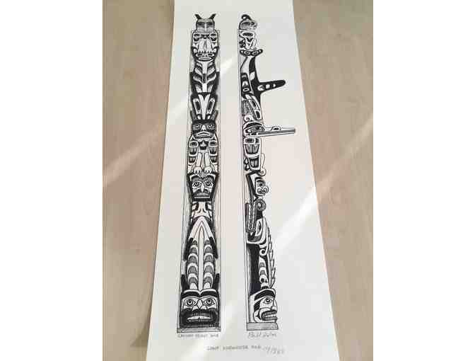 Black and white print of the new pole that went up at Camp Nor'wester in August 2018. Signed by Calvin Hunt and Bill Holm. Numbered out of 360. Print measures approximately 30 inches by 10.75 inches.