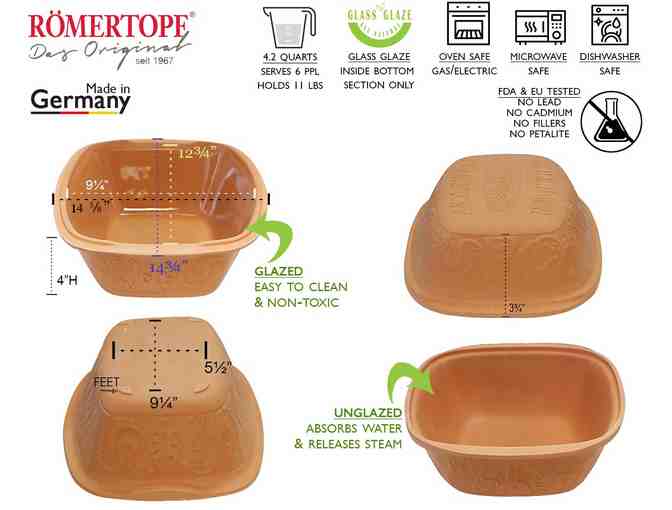 Clay baker handcrafted in Germany designed for making moist, delicious roasts, braises and breads. Soak the top before use, the lid will absorb water to create a blanket of steam inside and out; natural flavors are intensified