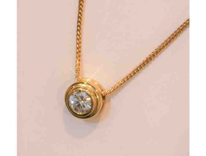The necklace itself is an 18k yellow gold, round, wheat-style chain (18" long), with an 18k yellow gold diamond bezel slide pendant. This gorgeous diamond is a round, brilliant cut, weighing approximately one carat, with a clarity of I-1 and a rare color of H (near colorless).