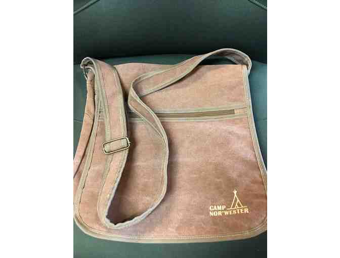 Highly-coveted, limited edition canvas messenger bag with the Camp Nor'wester tipi logo printed on the front. Roomy interior has space for a laptop computer and more. Sturdy, adjustable canvas strap can be worn cross-body or over the shoulder. Zippered pockets abound! Velcro fastenings keep the front flap secure, and the interior is protected by a zippered opening as well. Brown canvas with dark taupe edging and contrast stitching.