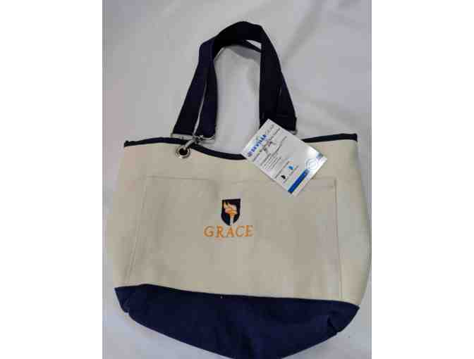 Seville Gear canvas mini boat tote cooler with GRACE logo and sized 14" X 5.5" X . 9.5". This tote has a fully insulated main compartment, holds 10 cans plus ice, large front pocket and 9" handle drop height. Made of 12 ounce cotton canvas.