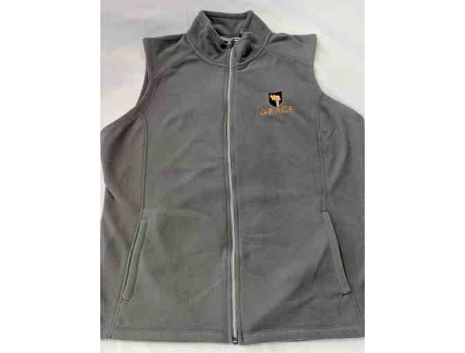 GRACE logo Women's Gray Fleece Vest from Port Authority. This super soft vest has two side pockets, front zipper and logo on left upper chest. Size Large