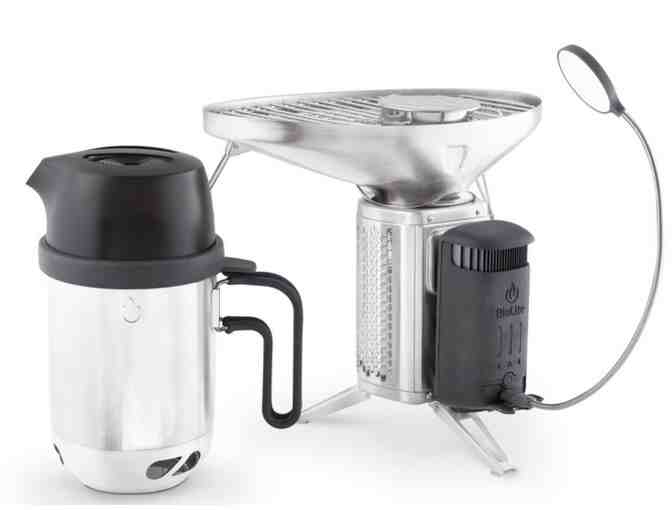Exclusively from the BioLite Shop. Grill, boil, cook, and charge with this fully integrated system. Generate electricity and smokeless wood flames with the award-winning CampStove 2 while cooking up your meals with the lightweight Portable Grill and KettlePot attachments. Included 100 lumen USB FlexLight illuminates your cooktop for a camp kitchen that's ready day or night. This limited-edition Midnight colorway features a textured slate finish on the CampStove and grey/black details on Grill and KettlePot.