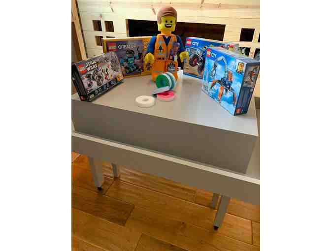 A handmade LEGO table with with drawers and a "catch-all" for the loose bricks. It opens to stash Legos inside the table itself and even the two seat open to storage. Comes with $200 worth of all new LEGO sets and toys. There is even a $20 gift certificate to The Brick Hut. Your kids will spend hours building on this specially designed toy.