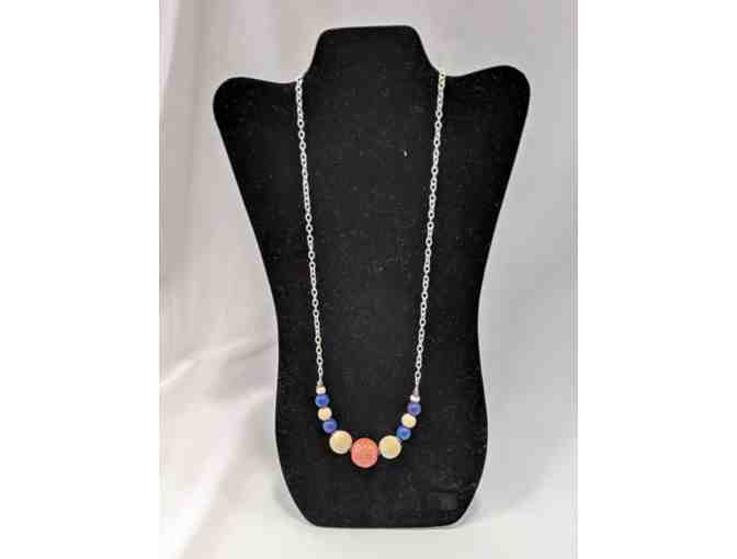 Show your school spirit and true style with this navy and orange 24" necklace handmade with lapis, ceramic and wood beads.