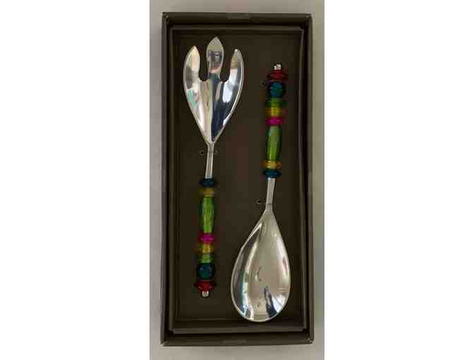 Elegant salad serving set- a large spoon and fork with jewel-tone handles in greens, blues and red. Perfect for your next dinner party!