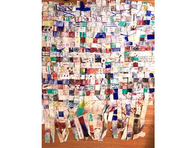 Color within the learning environment has the power to change the way we feel and grow. Inspired by the vivid colors and patterns of Ghanaian Kente cloth as well as the symbols those colors represent, the Bay Laurel students collaborated to identify their values as a classroom and paired them with color, imbuing each color in this artwork with its own unique meaning - Joy: Yellow, Knowledge and Study: Green, Teamwork: Red, Responsibility: Blue, and Respect: Black. The students then block-printed strips of canvas and wove them together to represent the strength of the Bay Laurel classroom community, made up of strong individuals who come together to work as one. The fabric is mounted on a wooden stretcher to be hung as an artwork.