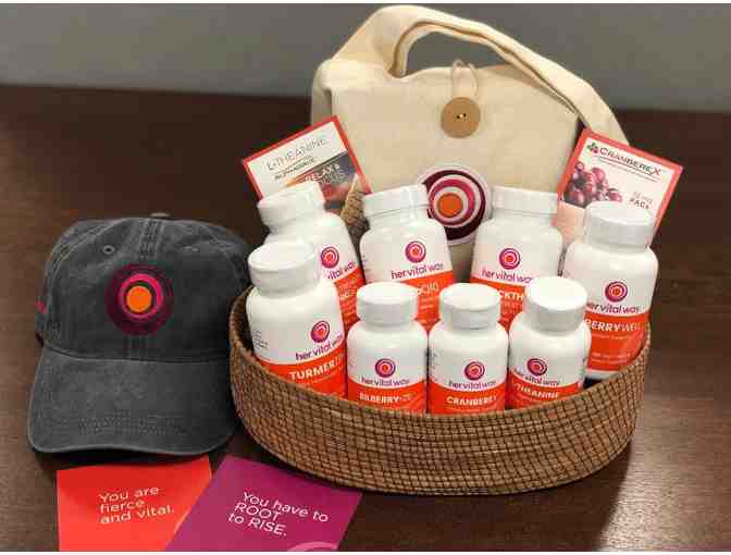 This handmade basket includes items from "her vital way." A hat, tote bag, 1 bottle each of the following supplements: Bilberry-25, C-Berry Well CoQ10, CranbereX, Extra Strength Ginkgo, L-Theanine, Sea Buckthorn, Turmerzing.