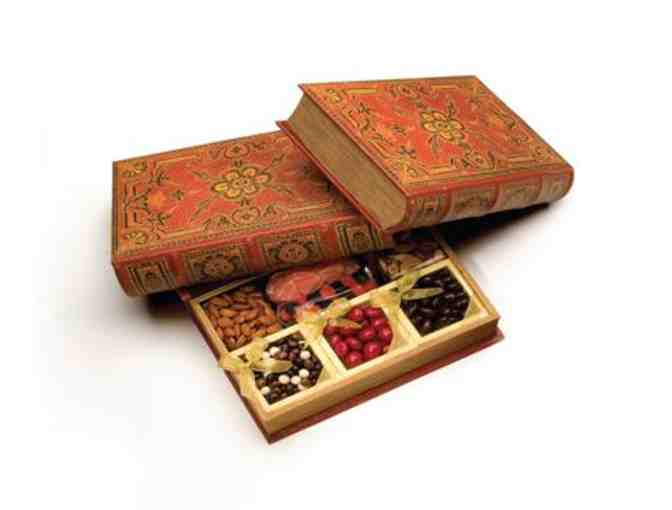 The luxury choice for the selective vintner. Cabernet wine truffles, chocolate all berry mix, dark chocolate almonds, smoky almonds, deluxe mixed nuts, and 9 piece canisters of champagne, chardonnay, cabernet and port wine infused chocolate indulges in an impressive leather book. This gift box is a unique alternative to the common gift basket and is the perfect gift for any occasion.