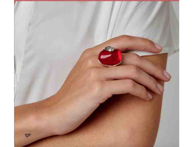 Chic and stunning woman's statement ring in silver-plated metal alloy featuring a red Murano crystal stone. Size 7.
