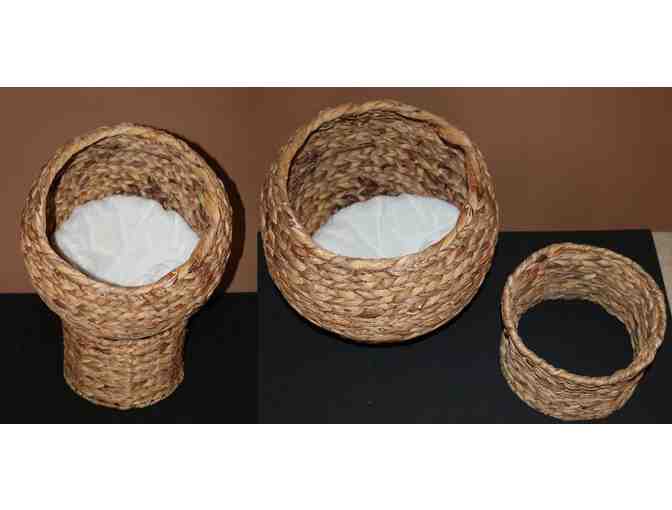 Up for auction is this 3-piece Wicker Cat Condo - opening is 11 inches in diameter and approximately 13 inches high in the front.