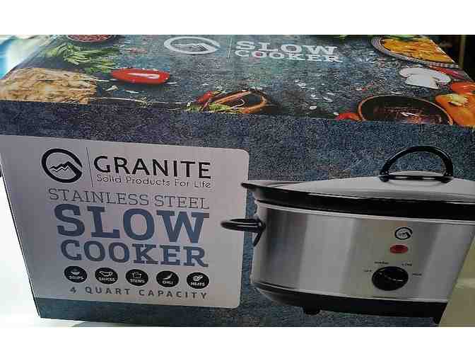 Perfect for small apt to cook chili, soup, sauces, meats or other favorite family recipes. Granite Stainless Steel 4 Qt capacity Slow Cooker comes with tempered glass lid, dishwasher safe, easy clean finish, removable stoneware pot; 3 convenient temperature settings (Warm, Low, High).