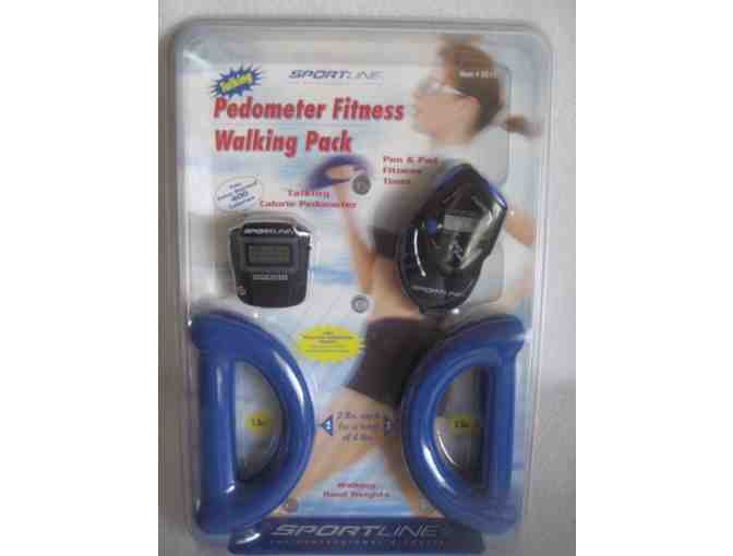 Includes: a talking calorie pedometer-displays steps, distance, calories, time exercising: also a 24 hr. stop watch, time of day etc. (neck strap included): the set is complete with a 2 lb weight for each hand to boost your walking/running fitness!
