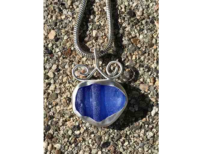 Blue ribbed beach glass, bezel set in sterling silver with a spiraled finding, on sterling snake chain. Pendant is 7/8” wide, 1 ¼” high from base to top of spiraled wire and 3/8” thick at its thickest spot. Winner may choose chain length: 18", 20", and 24" options available.