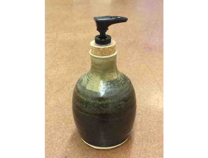 High fired handmade stoneware soap dispenser glazed with Japanese Teadust iron on the body and a clear gloss on the neck and inside by local artist David Weinstein. Measures 7 x 3.5 inches.