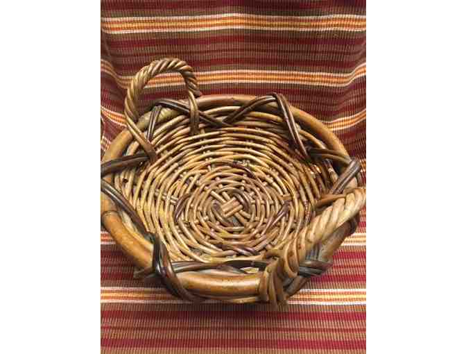 Rustic Woven Basket is 12 inches in diameter by 5 inches high. This sturdy basket would be great to display fruit or anything else.