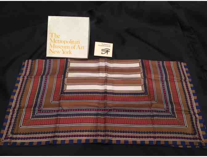 This beautiful 27 x 27 inch silk scarf was issued by the Metropolitan Museum of Art for their The Treasures of Tutankhamun exhibit in late 1978 and early 1979. With the cooperation of the Organization of Antiquities and the curators of the Egyptian Museum in Cairo, The Metropolitan Museum of Art issued a series of reproductions of objects found in the tomb of Tutankhamun. The design of this scarf was adapted from the back of the small ebony and ivory inlaid chair which was made for King Tutankhamun when he was a young boy.