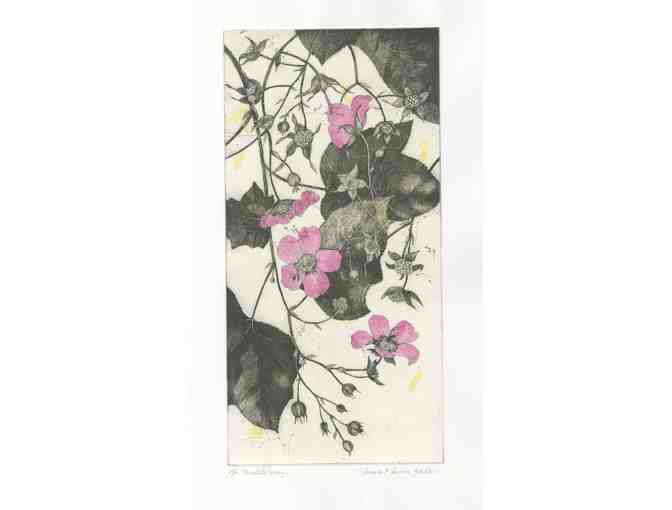 Description: "Thimbleberry" - aquatint etching, hand-colored, chine colle.