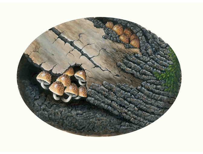 Description: Oval painting of Inky-cap mushrooms (Coprinellus sp.) growing out of a big leaf maple branch. Gouache