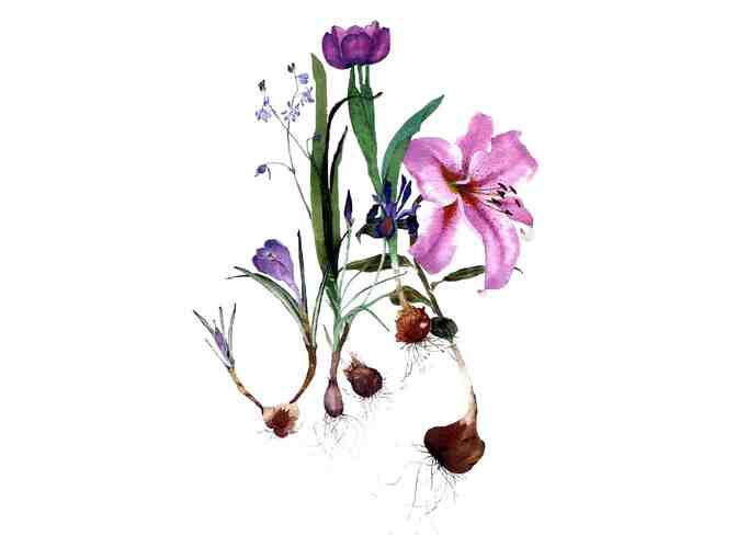 Description: Done with many transparent acrylic glazes, this layered painting features multiple blooming plants, including Oriental lily, tulips, squill, dwarf iris and crocus. My challenge was to depict the blooming phase while the bulbs were still full, so I worked on this painting over the span of almost a year.