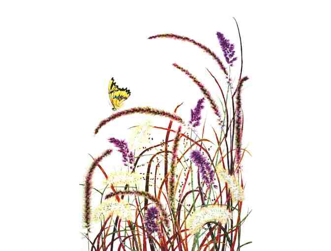 Description:This is a limited edition print of my original, detailed watercolor piece. It features a variety of ornamental grasses as they change during the autumn. Warm, golden hues combine with purples and greens. As the heavy seed formations both bend with their weight, yet reach for the sun, a yellow and black butterfly lightly lands. This piece was originally done on commission for the Denver Botanic Gardens, as a cover for their magazine.