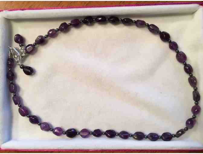 Genuine amethyst nugget beads- promote peace and positive feelings. Genuine hematite helps improve circulation. 18" necklace and earrings.