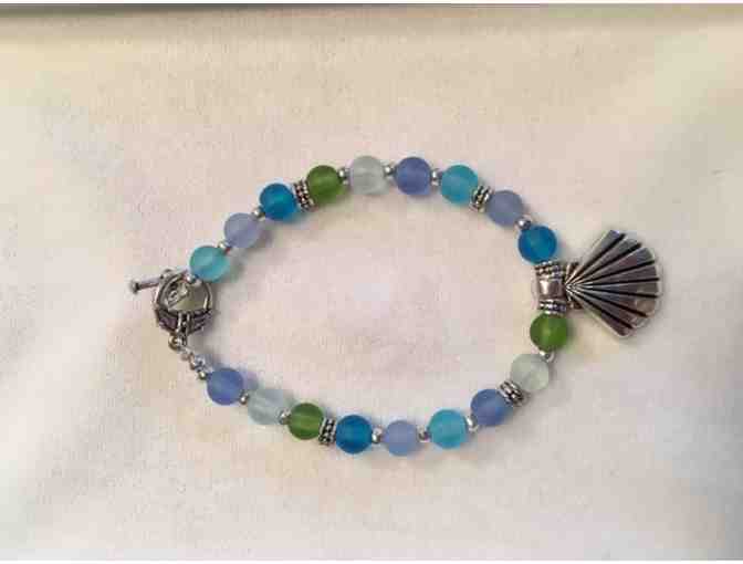 Bracelet made of frosted "Look of Sea Glass" beads from Colorado with white pewter shell charm and findings. 6 1/2 inches