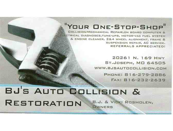 Gift certificate for 1 (one) 2 wheel alignment. For more information on BJ's Auto Collision & Restoration visit them on the web at www.bjsautocollision.com.