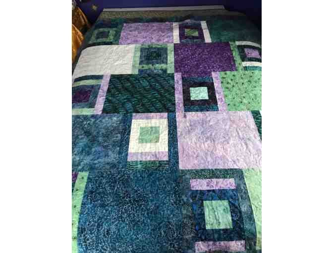 Beautiful handmade throw-sized quilt with lots of extra length! Quilter-designed. Each side has a different pattern so the quilt is reversible. Measures 77.5" x 65". Features blues, greens, and purples, with detailed machine-quilting stitches including stars and spirals.