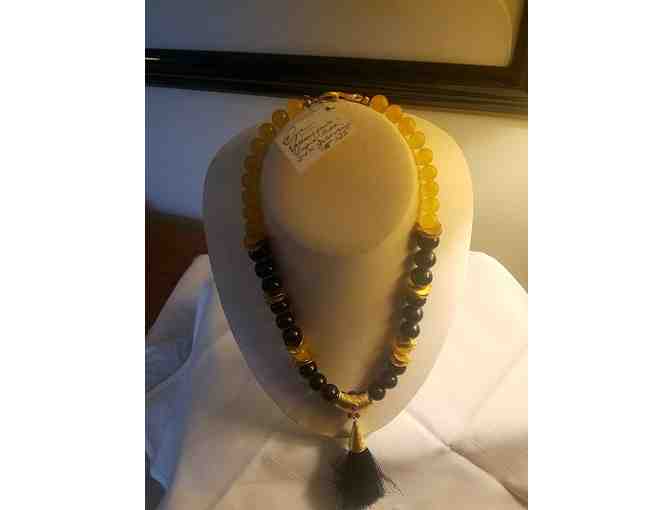 The winning bidder will enjoy this stunning Lapis and Yellow Jade Necklace, featuring 8mm Lapis Lazuli and 6mm Yellow Jade end with a navy blue silk tassel.