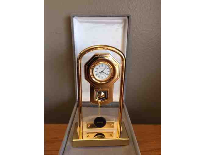Authentic brand new Bulova B0530 "Carousel" mini boutique desk clock. Goldtone polished metal case and frame. White dial with black hands. Protective glass lens. Quartz. Height is 4.75", width is 2".