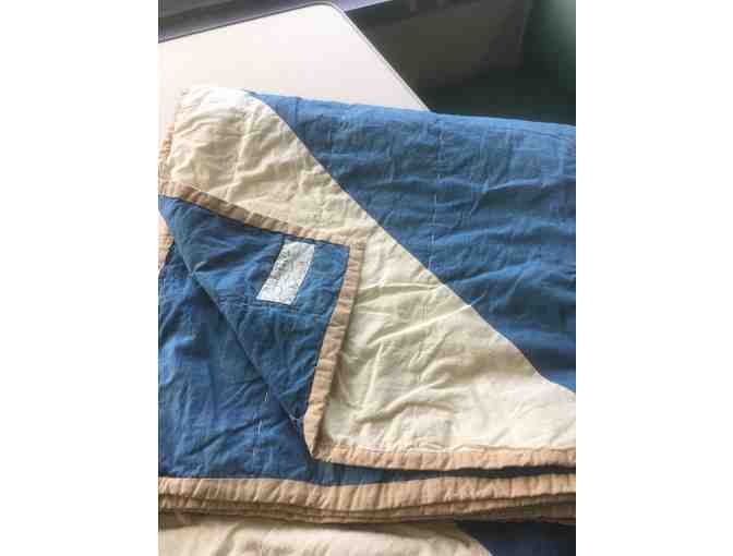 Quilt was made by Rachel in January 2019. All fabric dyed by Rachel and Victoria. Made with organic unbleached cotton, hand-dyed with indigo and madrone bark for the binding. Hand-quilted with sashiko thread. Measures approximately 101” x 103”; fits a queen bed with a generous overhang or a king bed with less overhang. Low loft batting, making it a great year-round quilt.