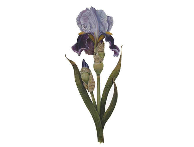 Description: Amigo Iris - Fully open, tall, purple, bearded iris, and bud with leaves: natural fram. Watercolor and gouache on paper.
