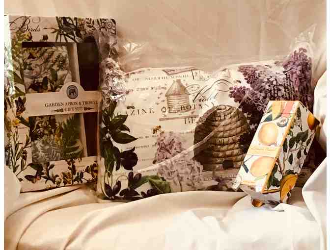 Garden Themed lovely package of Lilac, Pillow, gardening set, apron, lemon and basil lotion