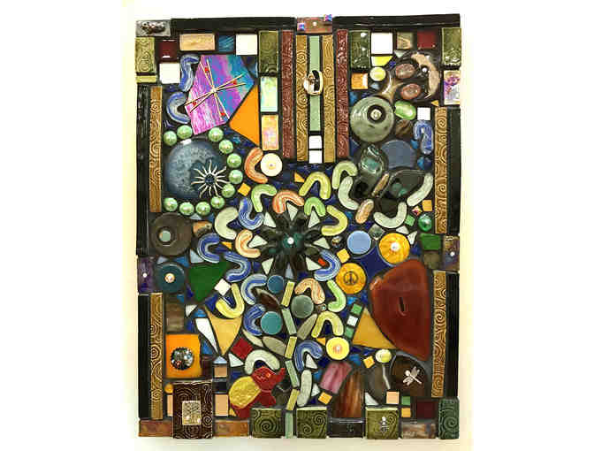 Mixed media 3-D mosaic made from second hand handmade tile, stained glass, repurposed jewelry, agates and swarosvski crystals for bling! Handcrafted by CLWS parent Jeana Sommers.