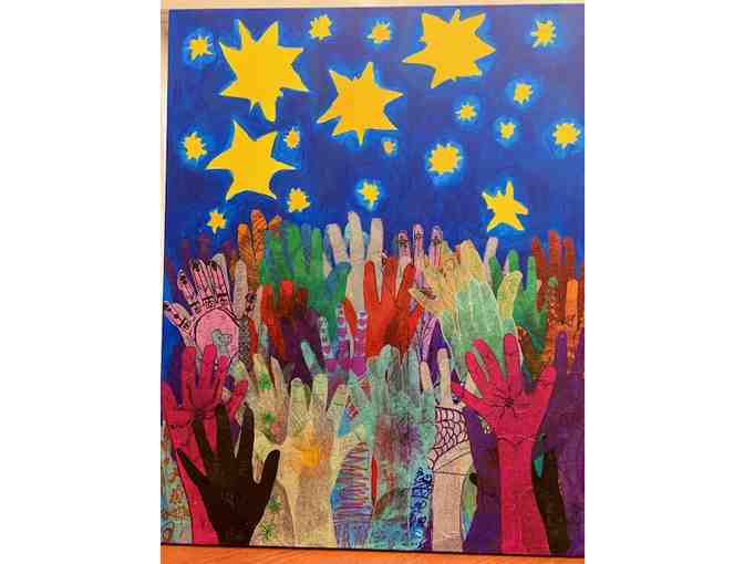 A beautiful large canvas featuring art and handprints from Ms. Lewis' Fifth Grade students. The backside of this canvas is signed by the students.