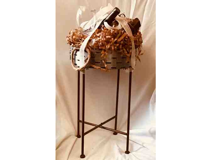 Small tray table, 2 fauxbois wine goblets, 2 bottles of wine, $14 chocolates gift certificate
